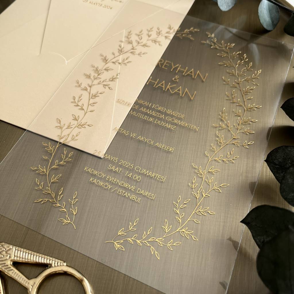 Celebrate your love story with our luxurious transparent acrylic wedding invitation, featuring intricate gold foil botanical detailing and a minimalist yet romantic design. The delicately printed gold wreath and leaf motifs on the clear acrylic sheet bring a touch of timeless elegance.