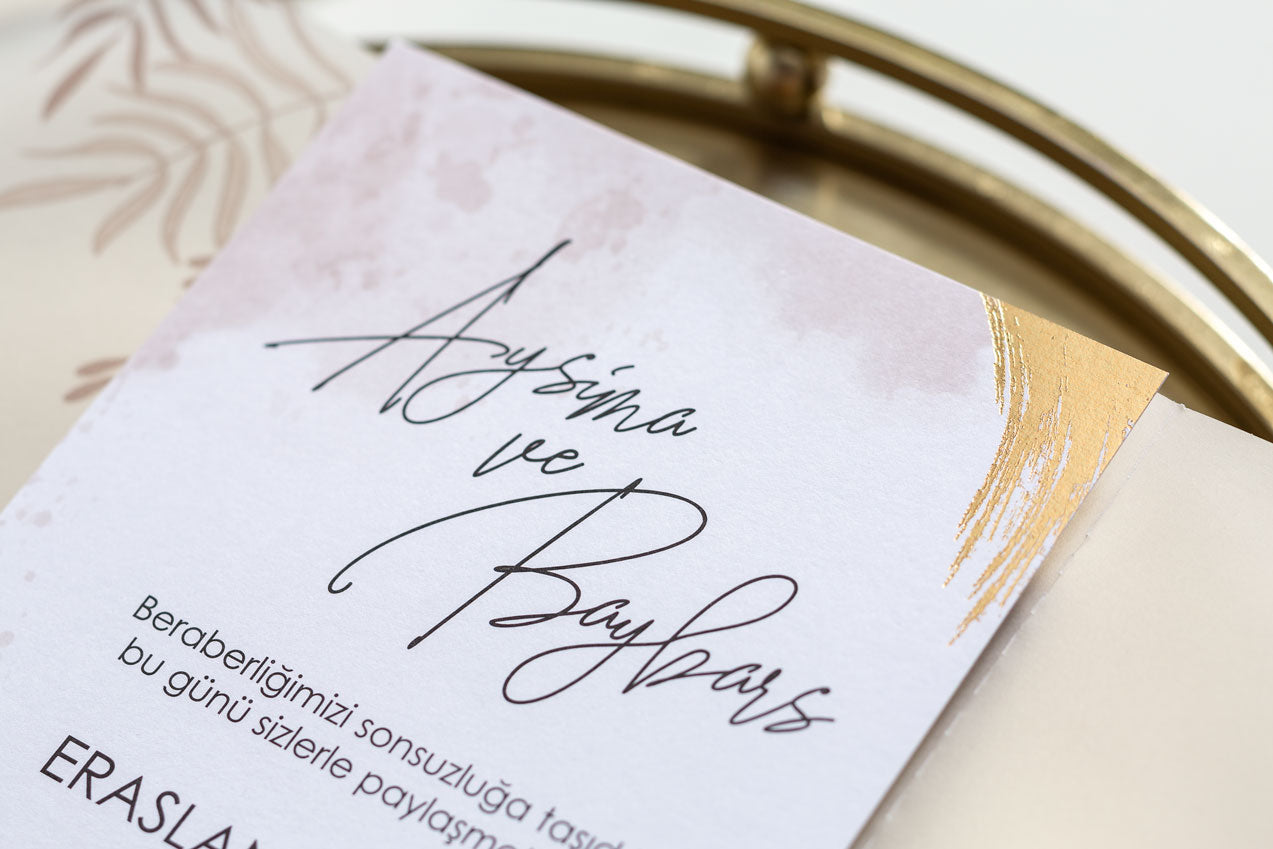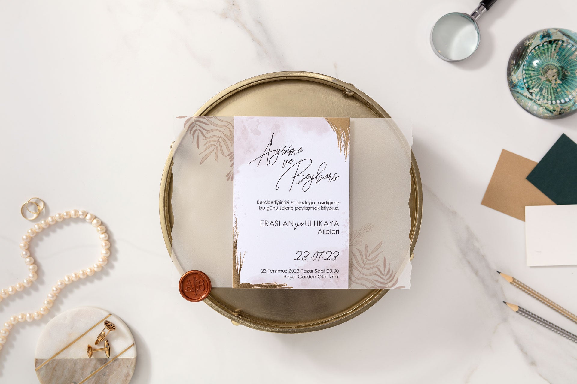 This exquisite wedding invitation blends minimalist luxury with timeless details. Featuring a translucent vellum wrap adorned with delicate botanical prints, it offers a dreamy first impression your guests wonโt forget.